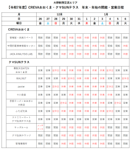 令和7年度、CREVAおおくま・クマSUNテラスの年末年始開館・営業日程は下記の通りです。
