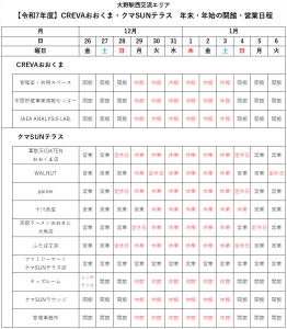 CREVAおおくま・クマSUNテラス 年末・年始の開館・営業日程
